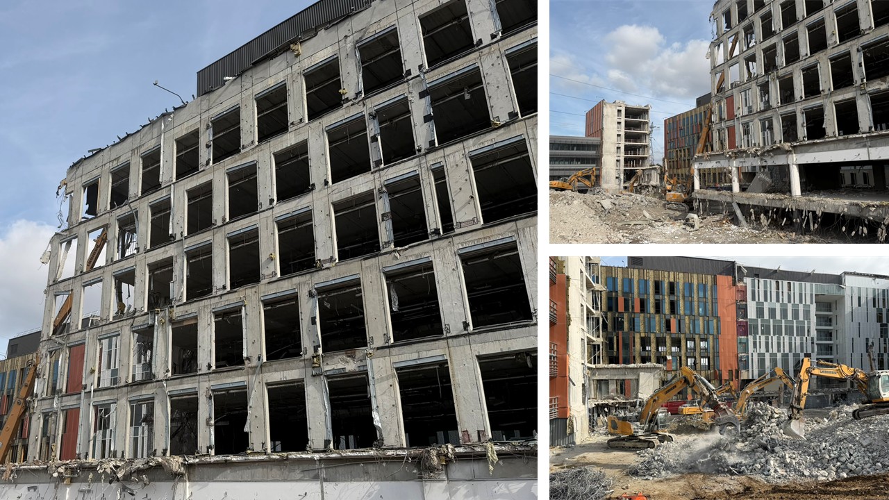 Après une première période de curage et de dépose soignée des façades et des matériaux de réemploi, le chantier du futur bâtiment d’activité à étages SKY CENTER situé à GENNEVILLIERS (92) ne passe plus inaperçu avec cette phase de démolition d’une partie des bâtiments.